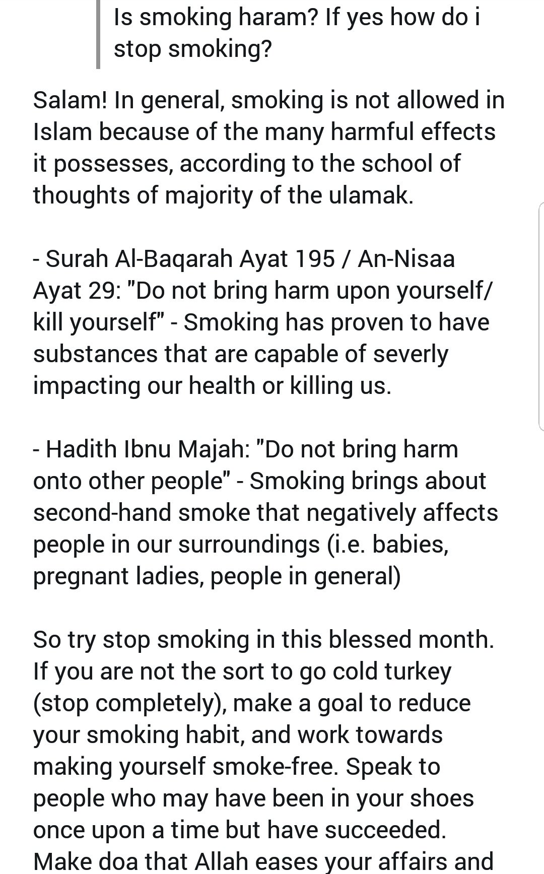 In view of the harm caused by tobacco, growing, trading in and smoking of tobacco are judged to be haram (forbidden). It puts you at increased risk of high blood pressure, heart disease, lung cancer, and other devastating illnesses. It must be haram to poison yourself, the horrible thing is my mind is a little less as toxic as the chemicals in smokes. If none of them is valid, it is makrooh to smoke. There is no evidence that smoking cannibus strengthens religious beliefs. Though people know the evil effects of smoking, it seems that shaytaan and their nafs wants them to continue wasting their money and cause harm to their bodies and health. Smoking reduces the capacity of thinking, you can go into depression. The majority of the scholars agree that smoking is haram, and all forms of tobacco are haram. All contemporary rulings condemn smoking as potentially harmful or prohibit (haram) smoking outright as a result of the severe health damage that it causes. Some base it on the following too: So, smoking is not the clean habit, it harms you, it affects your lungs and also, your brain. حَرَام, ḥarām, ħaˈraːm) is an arabic term meaning 'forbidden'. What makes food halal or haram?